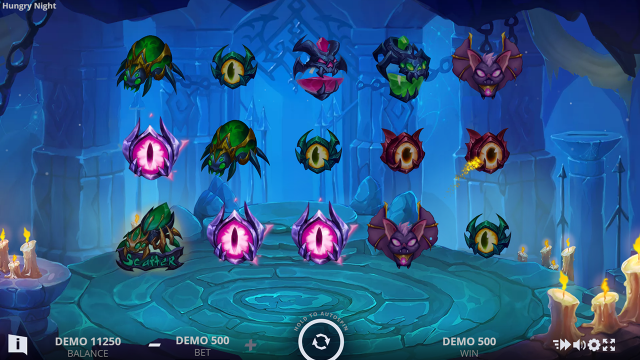 Игровой автомат Hungry Night выдержан в вампирской тематике. Это отражено не только в дизайне, но и в символике. На барабанах крутятся летучие мыши, пауки, жуткие монстры и даже пылающие глаза. В игре Голодная Ночь задействовано 8 базовых символов и два Скаттера, запускающих фриспины. Все базовые элементы оплачиваются в соответствии с Таблицей. После неудачного спина может активироваться одно из двух случайных событий.